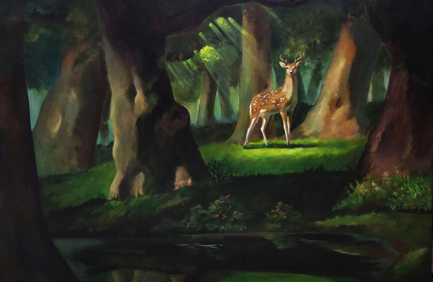 A deer moves through a mysterious forest, holding the grace of youth as it navigates life’s uncertainties, capturing the delicate tension between childhood and adulthood.