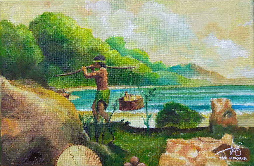 At daybreak, a Filipino native walks the shore with his basket, the calm sea and distant island bearing witness to an ancestral life of discipline, quiet strength, and deep respect for the rhythm and purpose of each new day.